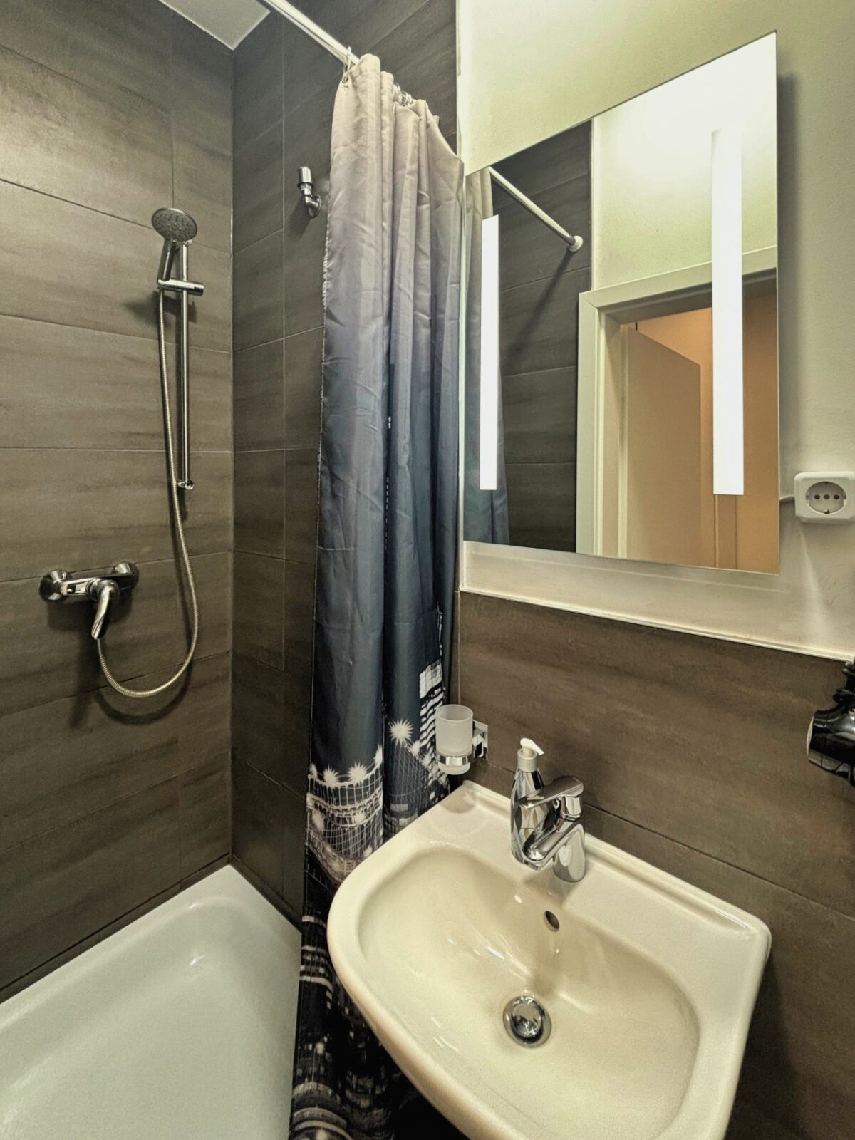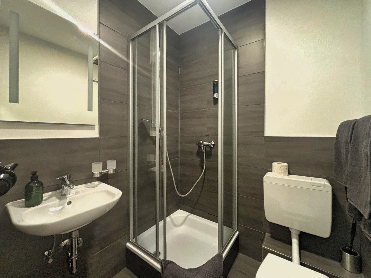 Saubere, moderne Badezimmer mit frischen Handtüchern und allem Nötigen.