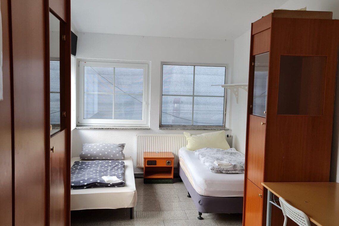 This cozy bedroom features two comfortable single beds (90cm x 200cm), a dining/work desk with two chairs, and 2 narrow wardrobes.