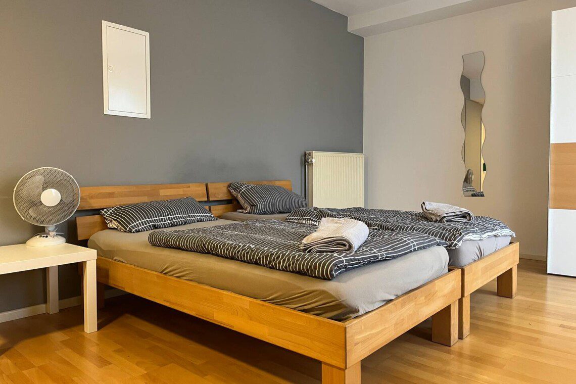 Die Wohnung ist mit zwei komfortablen Betten (90m x 200m) ausgestattet, die zu einem großen 180m x 200m Bett zusammengeschoben werden können. Zusätzlich gibt es einen Tisch mit zwei Stühlen, einen Kleiderschrank und eine voll ausgestattete Einbauküche (ohne Backofen). Solltest du zusätzliche Bettwäsche, Kissen, Handtücher oder ähnliches benötigen, stellen wir dir dies gerne kurzfristig zur Verfügung.